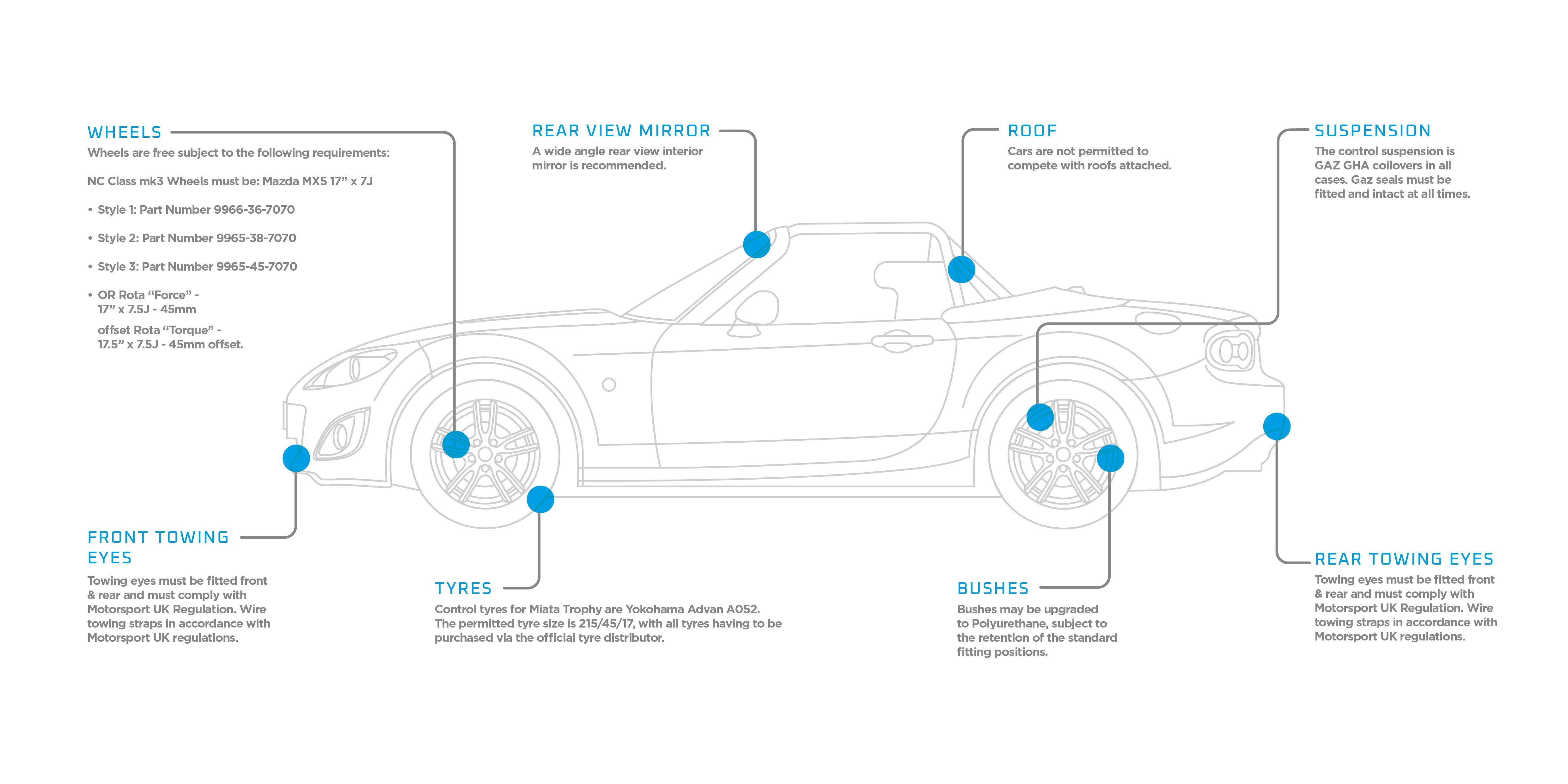 NC Classed Miata Trophy entrants must compete in a standard Mk3 MX-5 Chassis Code NC (including NC2 or NC3). The original silhouette must be maintained, except the variation caused by the fitment of wire towing straps in accordance with Motorsport UK regulations.
